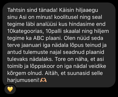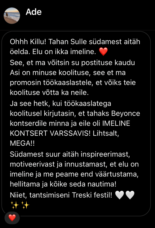 Olen sertifitseeritud arengutreener (Certified Life Coach™) aastast 2021 ning keskendun teadlikule enesejuhtimisele ja jätkusuutlikule enesehoiule.